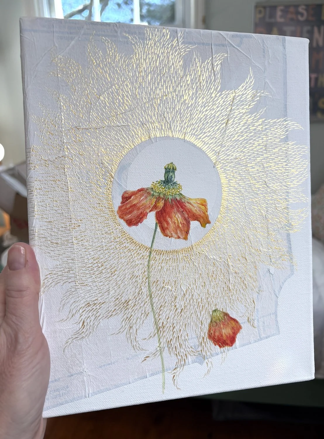Watercolor, Collaged Sewing Pattern, Gesso, on Canvas. 8”x10”